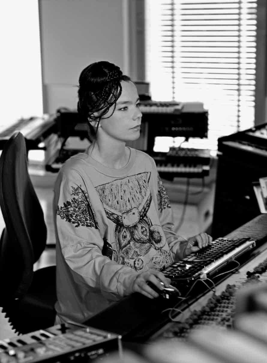 Björk on vasta hiljattain selvittänyt, mitä Utopia voi tarkoittaa. Pitkään, kuten hän on tapana, hän loi sen ilman valtavaa ideaa, vain työtä. Hänen musiikki liittyy hänen tutkimalla pieni laukaisee, connecting ”emotionaalinen koordinaatit”; vastaavia teknisiä ongelmia musiikillisia tavoitteita; käsittely tulokset vietetty aika muusikot, toimittajat, tuottajat; järjestäminen, äänitys, editointi, miksaus. Enimmäkseen editointia., ”80 prosenttia musiikistani on sitä, että istun läppärini ääressä editoimassa. Viikot ja viikot jokaisella biisillä, hän sanoo. Nyt se on ohi, hän on järjestelyratapihat hänen lukuisa ideoita – musikaali, käsitteellinen, tajuissaan, alitajuntaan – yrittää järjestää kaiken yhdeksi siteeraamisen arvoinen ajatus. Hän on työstänyt albumia kaksi ja puoli vuotta. Olen kuullut sen tasan kerran. 75 minuuttia sitten laitoin naapurihuoneessa kuulokkeet läppäriin ja kuuntelin utopiaa loppuun asti. Heti sen jälkeen kävelin tähän huoneeseen puhumaan Björkin kanssa siitä, mitä olin juuri kuullut., Utopiaa en kuule muuten, sillä Björkin edellinen albumi Vulnicura vuoti verkkoon kolme kuukautta ennen julkaisupäiväänsä. Välillämme oleva joki pyörii hänen kokemustensa mukana. Varpaani ovat tuskin märät.