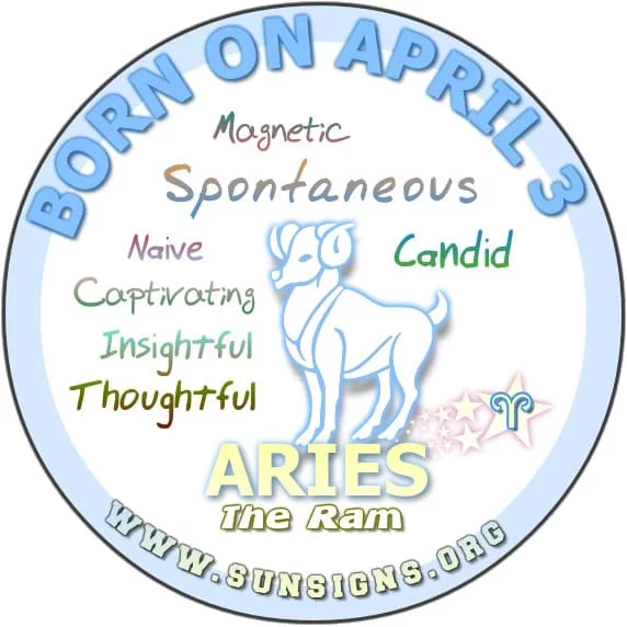 HVIS DIN BURSDAG PÅ April 3, du har en rekke beundrere. På sosiale arrangementer, du er grunnen til at alle viser opp. Folk verdsetter din mening, men du er veldig grei noen ganger. Dyrekretsen tegn for en 3. April fødselsdato er Væren.
