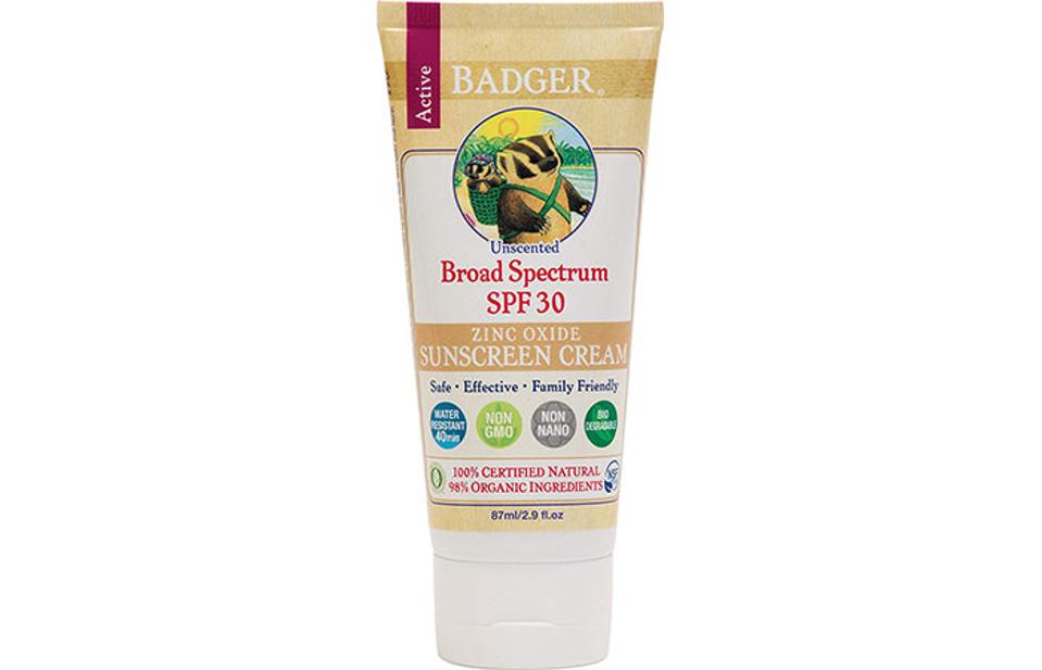 borsuk utrzymuje podstawową pielęgnację skóry, która obejmuje ochronę przed słońcem., Bezzapachowy Krem przeciwsłoneczny z tlenkiem cynku wykorzystuje tylko pięć naturalnych, organicznych składników: olej słonecznikowy, wosk pszczeli, rokitnik i witaminę E. bez okrucieństwa i przyjazny dla RAF, ten codzienny niezbędnik jest odporny na wodę i pot przez 40 minut i chroni przed promieniowaniem UVA i UVB.,